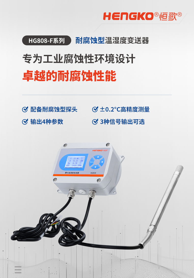 HG808-F系列耐腐蝕型溫濕度變送器/傳感器專為工業(yè)腐蝕性環(huán)境設(shè)計,采用高品質(zhì)傳感器和先進(jìn)制造工藝,具備卓越的耐腐蝕性能。外殼選用優(yōu)質(zhì)不銹鋼材質(zhì),防護(hù)等級高達(dá)IP65,能有效防塵、防水。傳感器探頭由耐腐蝕性材料制成,并經(jīng)過耐腐蝕性表面處理,抗腐蝕能力強(qiáng),確保在惡劣條件下穩(wěn)定工作。