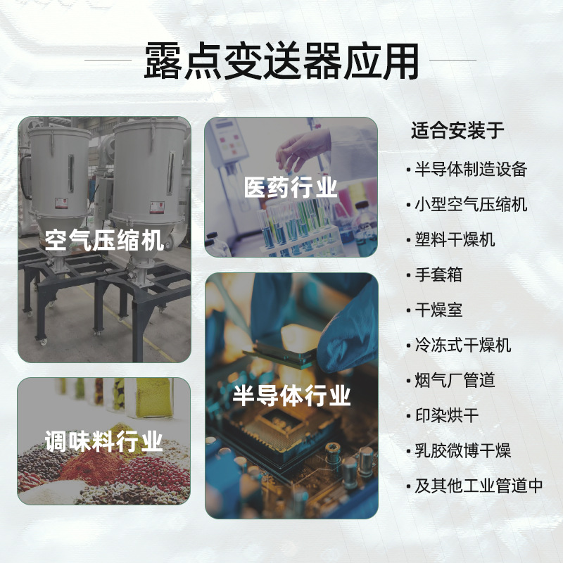 應(yīng)用領(lǐng)域 鋰電池生產(chǎn)、電子元器件制造、半導(dǎo)體制造、電力工程設(shè)備;可集成于干燥系統(tǒng)、壓縮空氣系統(tǒng)、恒溫恒濕系統(tǒng)等設(shè)備中,用于氣體潮氣檢測。